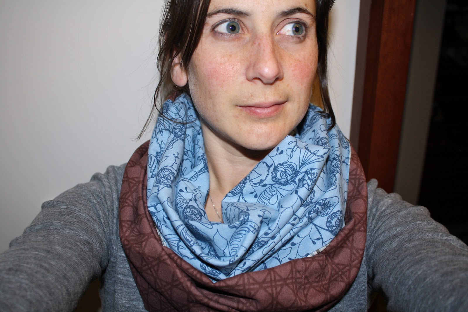 But now I'm back in Seattle, and back to being hunched over my sewing machine in the evenings like a little elf. I've been experimenting a bit with different fabrics for infinity scarves. I made a linen one, which is light and airy - perfect for spring/summer. I also used some men's shirting to make this one. Jury's still out on whether this works or not. I am actually kind of scared to hear what Tim Gunn would say. I kind of like it, though. I've worn it several times, but I have yet to hear a compliment on it... which makes me wonder. Maybe it is a little too stiff? Should I try seersucker for the same pattern but a more billowy look/feel? What do you think?
